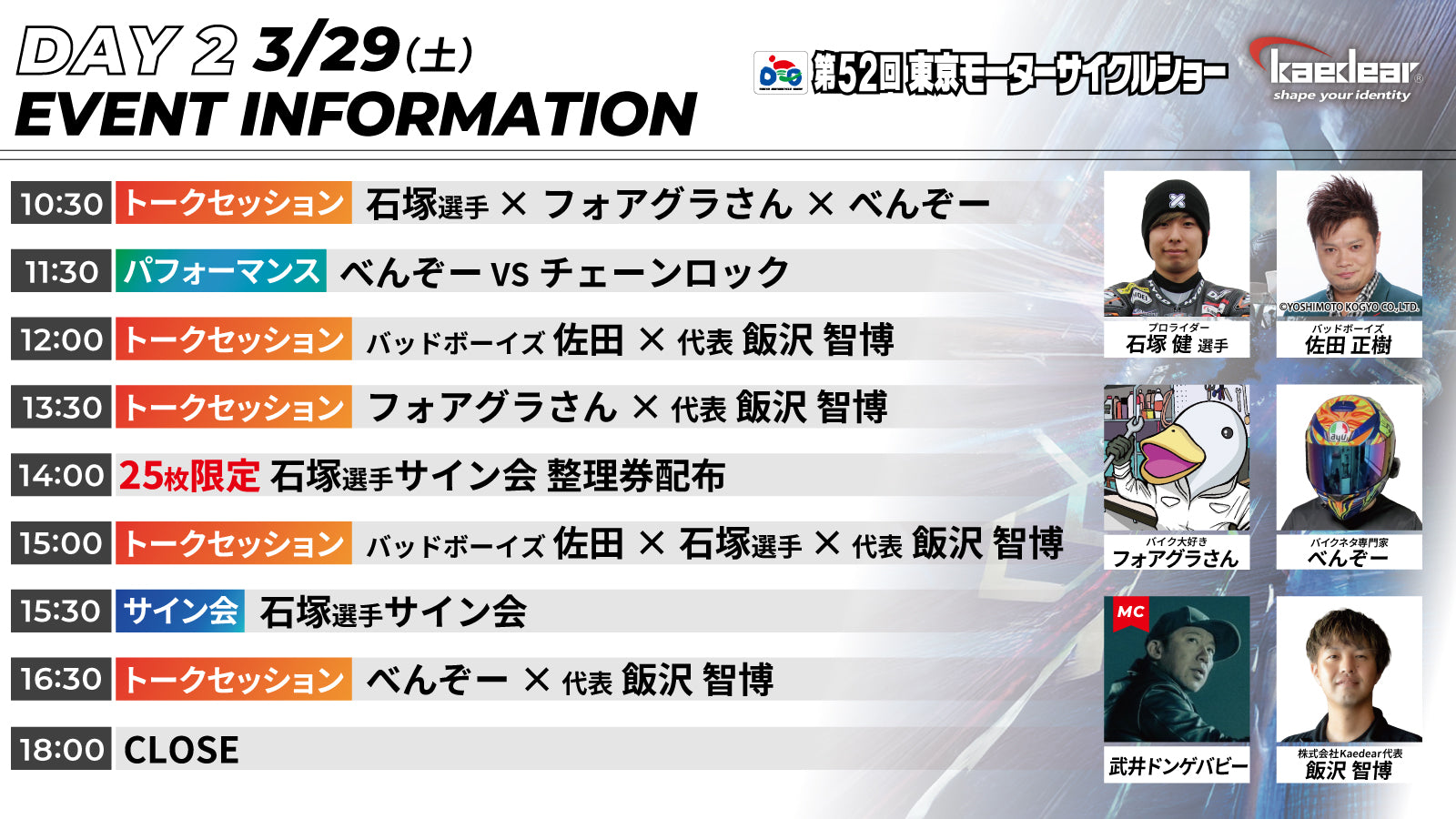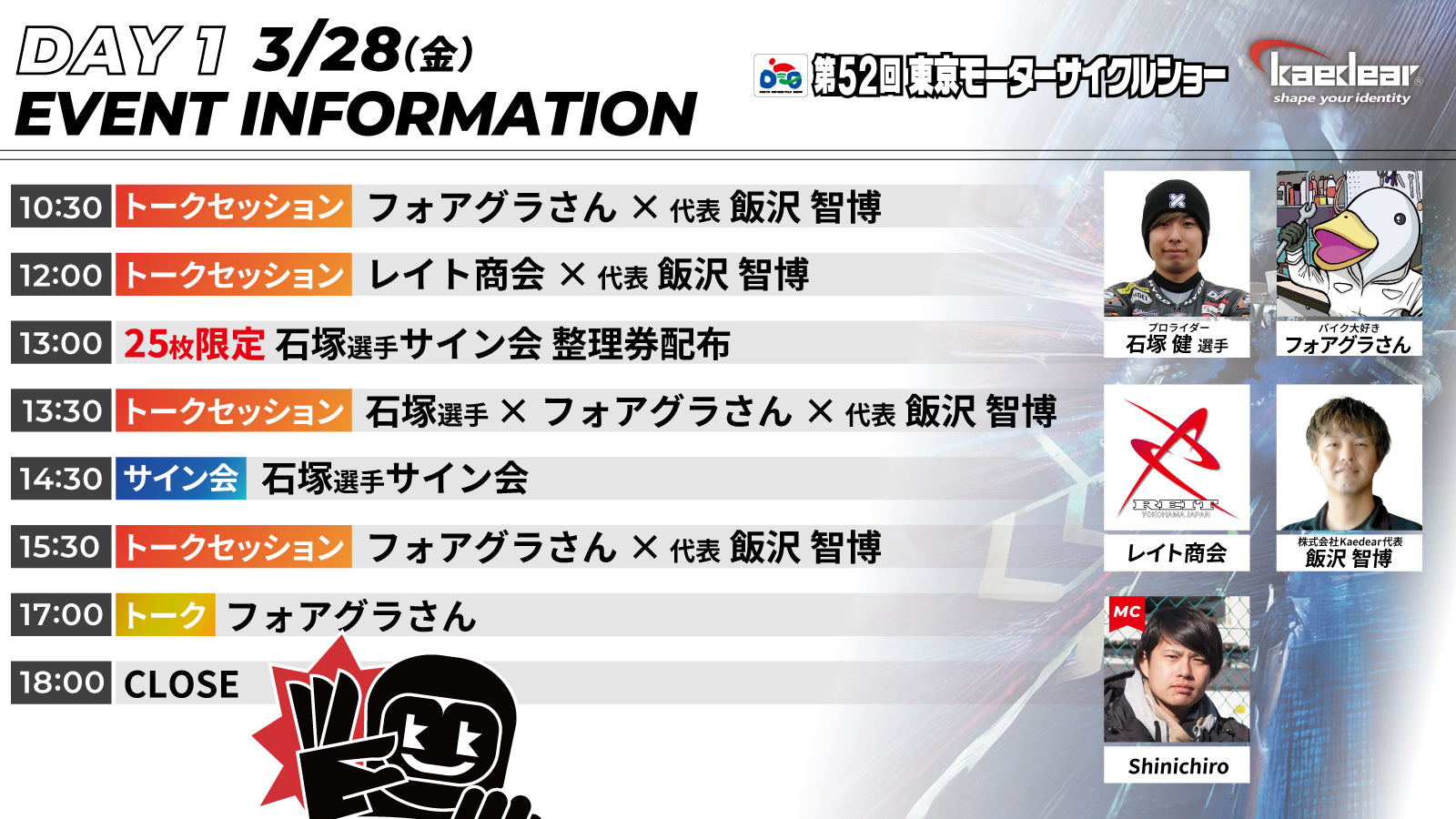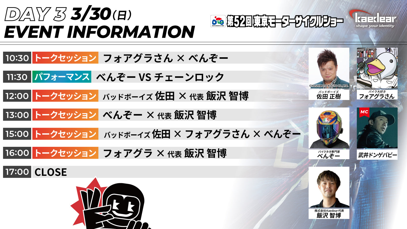 新世代インフルエンサー!!TikTok登録者は4万人超え。ショート動画を中心にバイク情報をお届け。その人気はまさに急上昇中だ。直近では、カエディアとのコラボショート動画にも注目が集まっている。実はトレードマークのインナーグローブを密かに開発中らしい。普段人前に姿を見せない男だが、持ち前のトーク力と圧倒的な"筋肉"で会場を魅了してくれるだろう。間違いなく動画では着痩せするタイプだ。