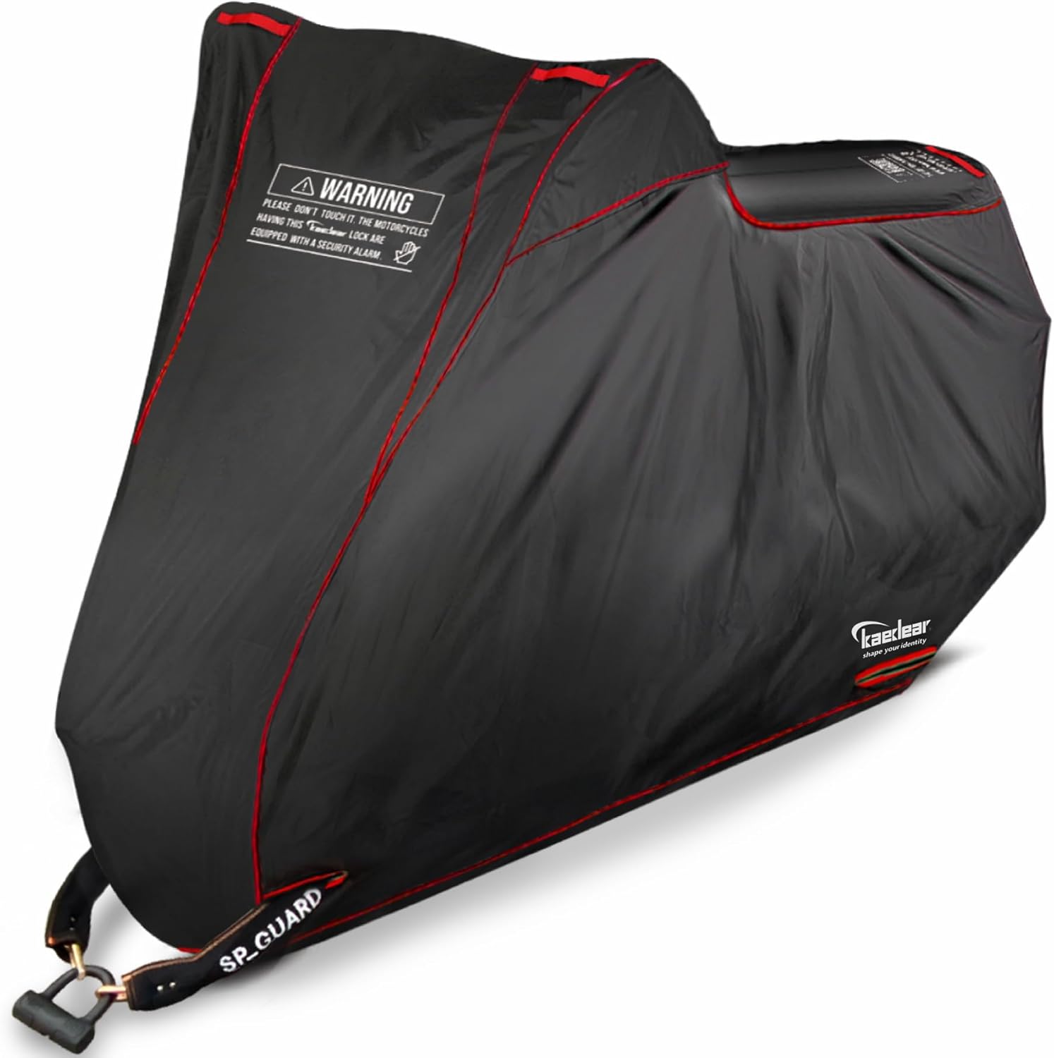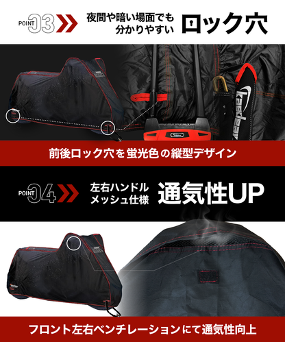 デザイン性・機能性を兼ね備えたバイクカバー。300デニール防水オックスフォード+TPUフィルム+フリースの一体生地で、愛車をしっかりと保護します。フリースライニングを採用し、柔らかな裏地が車体に触れる部分をやさしく守り、塗装やスクリーン部分への傷を防ぎます。適度な重みがあり、風に飛ばされにくく、愛車をしっかりと保護します。太陽光・雨・風からの影響を抑え、優れた耐久性を持つこのカバーには、セキュリティ警告文が印字されており、視覚的な威嚇効果で防犯性も高めています。